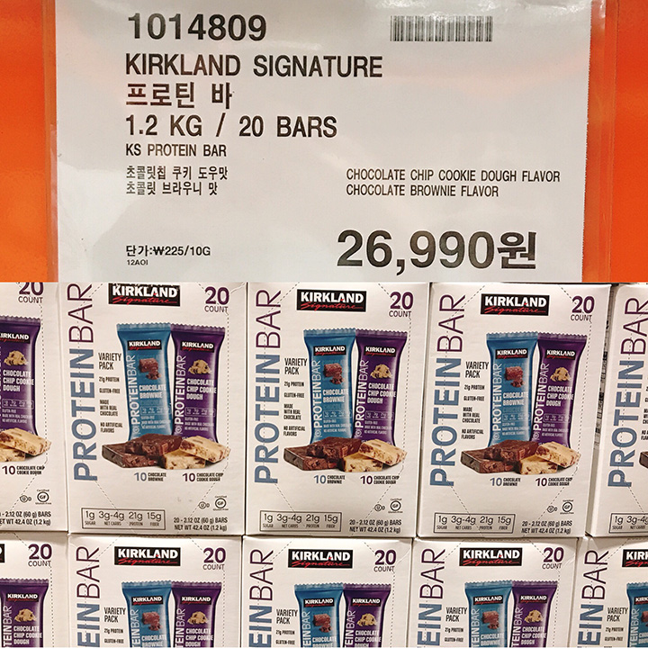 코스트코에서 판매하는 커클랜드 프로틴바. 가격 변동은 늘 약간씩 있지만 큰 차이나진 않는다.